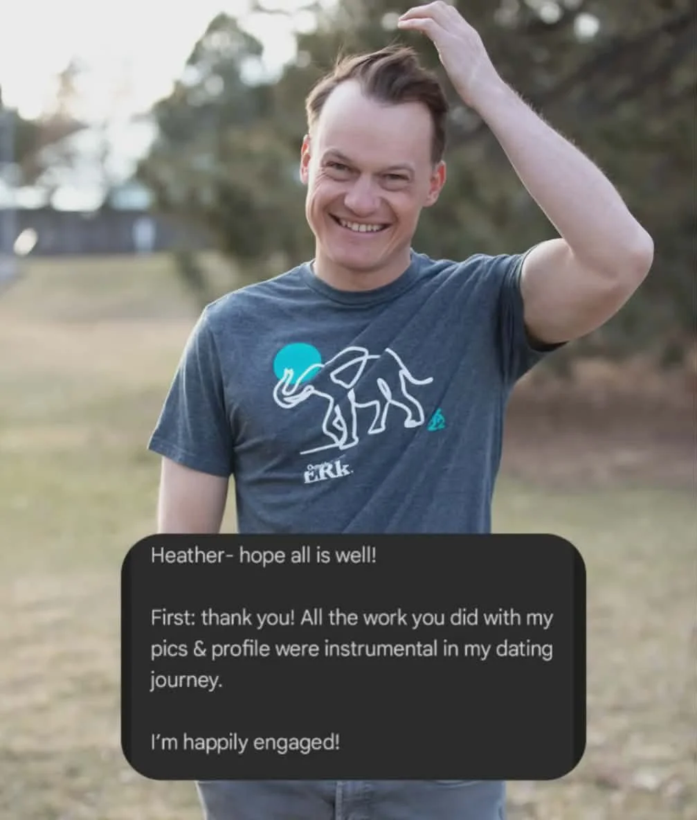 “I had been on the apps for a few months and wasn't seeing a lot of interest. I realized my profile was too important to just post random selfies and hope for the best. In June, I met with Heather to come up with ways to show, not tell, who I am. So glad I did - interest since then has skyrocketed! If you're wondering why you're not seeing a lot of interest in your profile, maybe it's because you're not putting your best foot forward. Give Heather a call. Worth every penny!” - Nick